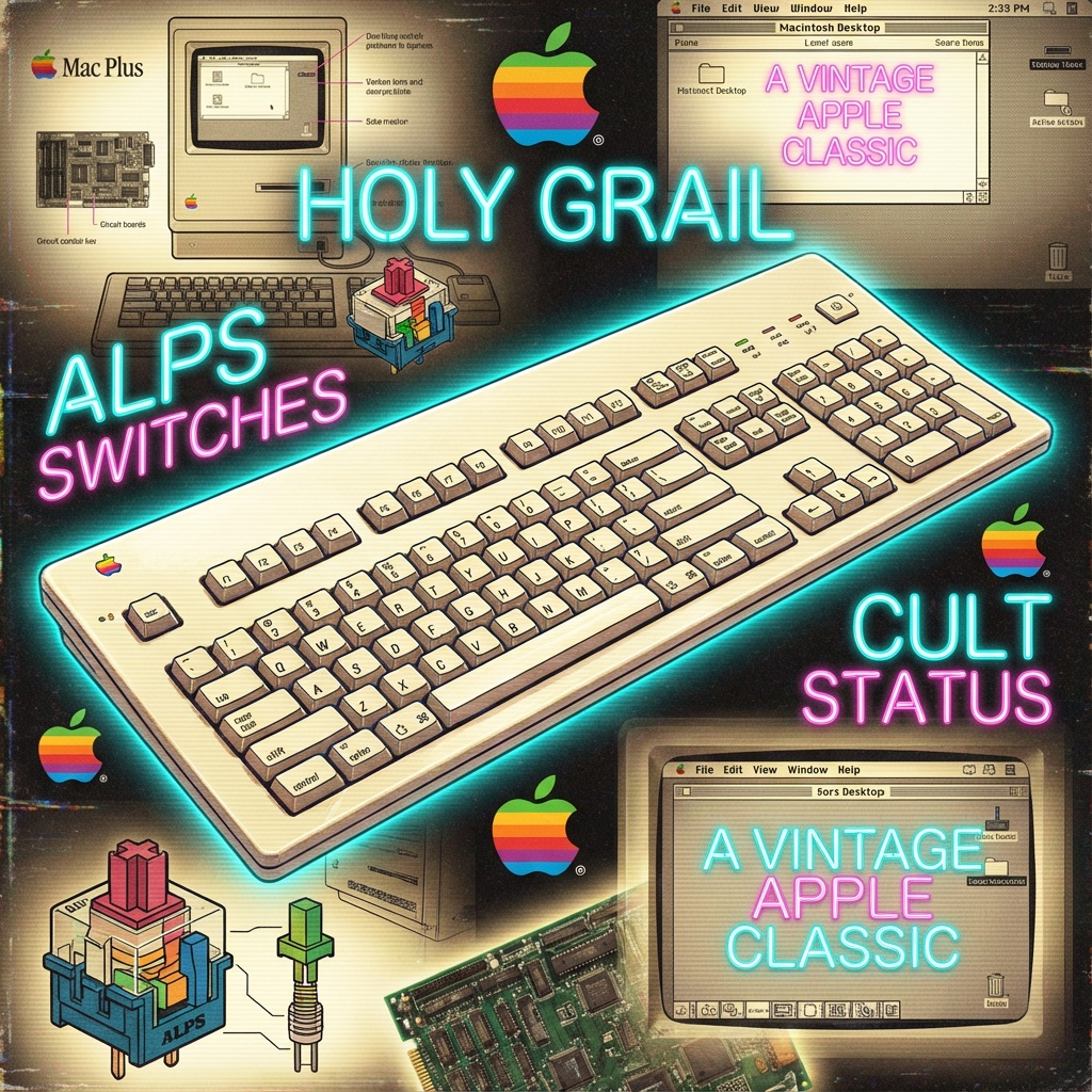 1987 - Apple sort l'Apple Extended Keyboard (AEK) avec des switches Alps SKCM Orange ou Salmon — deux variantes tactiles qui font aujourd'hui pleurer les collectionneurs. En 1990, l'AEK II arrive avec des Alps Cream Damped (plus silencieux, moins recherchés).