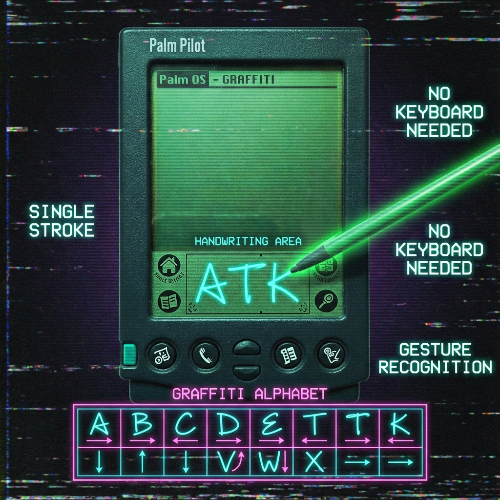Parlons du truc le plus WTF du Palm Pilot : Graffiti, son système de reconnaissance d'écriture. Plutôt que de tenter de déchiffrer votre pattes de mouche comme le Newton d'Apple (qui se faisait ridiculiser dans Les Simpson pour ça), Palm a eu une idée radicale : inventer un nouvel alphabet simplifié.